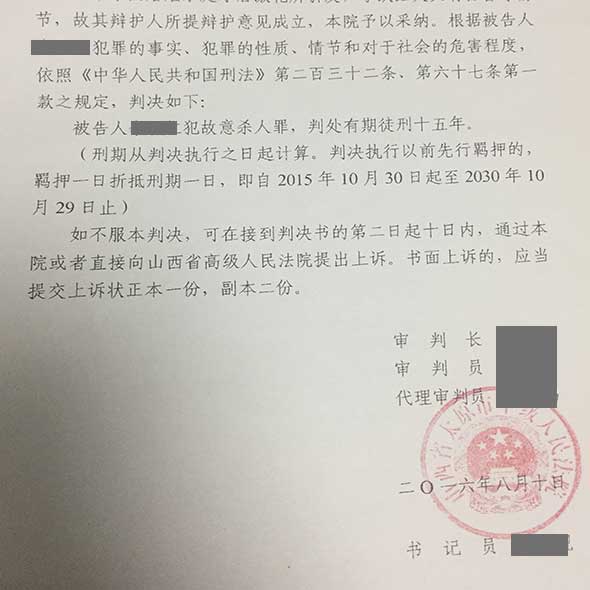 李某某涉嫌故意杀人案,该案案件进入法院阶段后,由靳志斌、史晨烨律师为其辩护,经过辩护律师充分阐述本案的特殊情况,最终太原市中级人民法院判处李某某有期徒刑十五年。